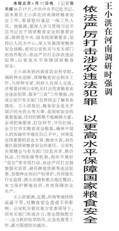 6月17日,中共中央书记处书记、国务委员王小洪在河南调研粮食安全工作,看望慰问基层一线工作人员。他强调,要深入学习贯彻习近平总书记关于国家粮食安全的重要论述,按照党中央、国务院部署要求,坚持以人民为中心,深入实施国家粮食安全战略,密切公安机关与有关部门的协作配合,依法严厉打击涉农违法犯罪,以更高水平保障国家粮食安全。(今日《人民日报》3版)