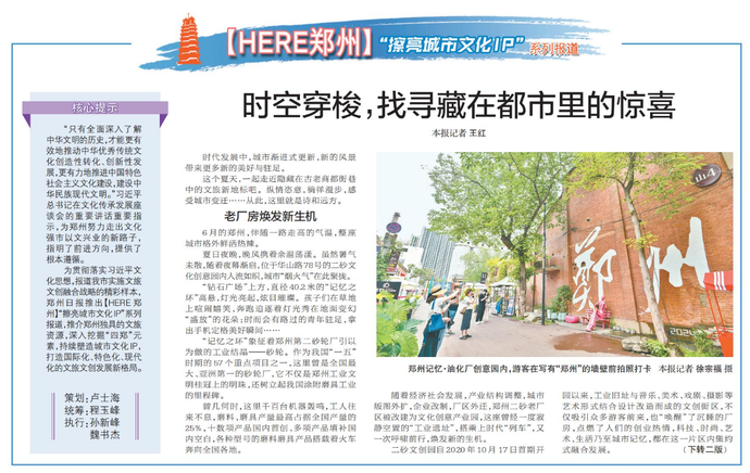 这个夏天,一起走近隐藏在古老商都街巷中的文旅新地标吧。纵情恣意,徜徉漫步,感受城市变迁……从此,这里就是诗和远方。(今日《郑州日报》1版、2版)