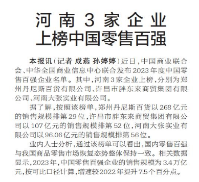 近日,中国商业联合会、中华全国商业信息中心联合发布2023年度中国零售百强企业名单。其中,河南3家企业上榜,分别为郑州丹尼斯百货有限公司、许昌市胖东来商贸集团有限公司、河南大张实业有限公司。(今日《郑州日报》1版)
