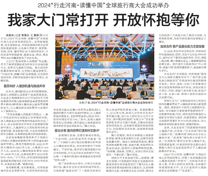 把世界旅行者请进来,让河南文化走出去。6月17日,2024“行走河南·读懂中国”全球旅行商大会在郑州召开。来自世界旅游联盟、亚太旅游协会、世界旅游城市联合会等国际旅游组织与近30个国家和地区以及国内旅游局、旅游企业、酒店、景区等约300名嘉宾参会,共话河南旅游国际化发展。(今日《河南日报》2版)