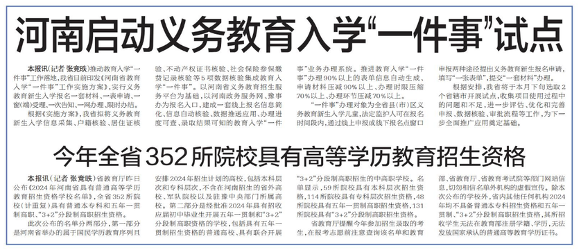 省教育厅昨日公布《2024年河南省具有普通高等学历教育招生资格学校名单》,全省352所院校(计重复)具有普通本专科和五年一贯制高职、“3+2”分段制高职招生资格。(今日《郑州日报》5版)