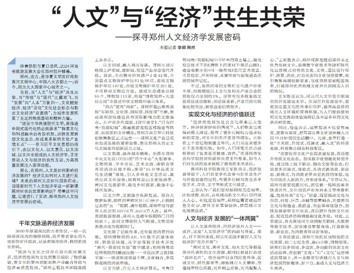当前,当“人文”与“经济”共生共荣,当“传统”与“现代”比翼双飞,当“发展”向“人本”万象归一,文化赋能经济、经济“活化”文化社会形态勾勒出文化经济“双面绣”,为城市发展积累了充足的物质基础和精神力量。(今日《郑州日报》6版)