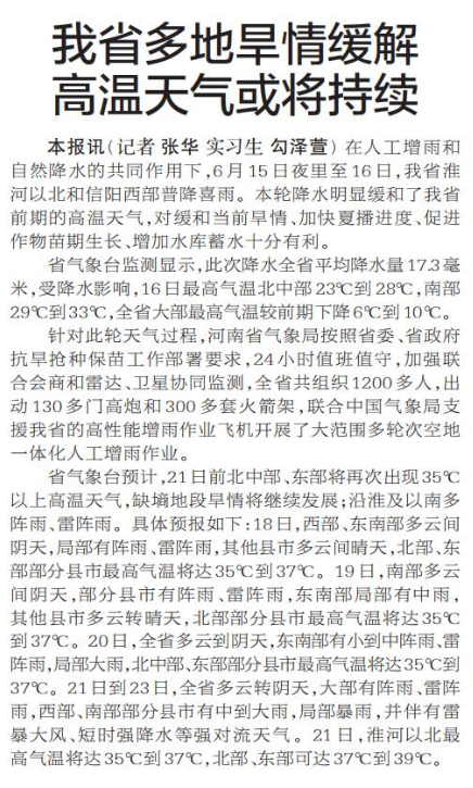 在人工增雨和自然降水的共同作用下,6月15日夜里至16日,我省淮河以北和信阳西部普降喜雨。本轮降水明显缓和了我省前期的高温天气,对缓和当前旱情、加快夏播进度、促进作物苗期生长、增加水库蓄水十分有利。(今日《郑州日报》6版)