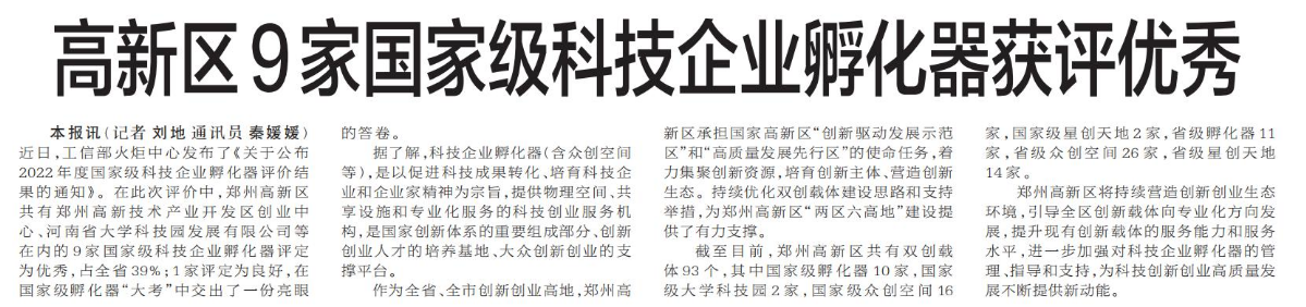 近日,工信部火炬中心发布了《关于公布2022年度国家级科技企业孵化器评价结果的通知》。在此次评价中,郑州高新区共有郑州高新技术产业开发区创业中心、河南省大学科技园发展有限公司等在内的9家国家级科技企业孵化器评定为优秀,占全省39%;1家评定为良好,在国家级孵化器“大考”中交出了一份亮眼的答卷。(今日《郑州日报》7版)
