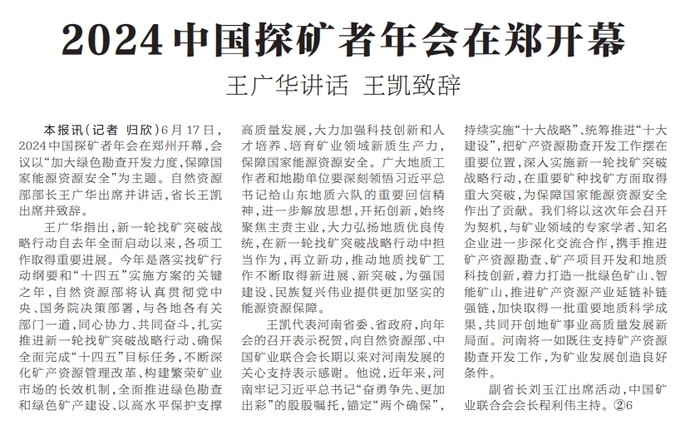 6月17日,2024中国探矿者年会在郑州开幕,会议以“加大绿色勘查开发力度,保障国家能源资源安全”为主题。自然资源部部长王广华出席并讲话,省长王凯出席并致辞。(今日《河南日报》1版)