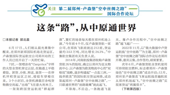 7时,一架喷涂有“Cargolux”字样的大型全货机穿过云层,在跑道上平稳着陆。卸货、分拣、转送、装货……在停机坪和货运区之间,接驳车穿梭往来。3个小时后,全货机满载百余吨货物腾空而起,“出海”飞往意大利米兰。(今日《河南日报》1版、4版)