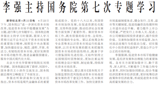 4月22日下午,国务院以“进一步深化资本市场改革,促进资本市场平稳健康发展”为主题,进行第七次专题学习。国务院总理李强在主持学习时强调,要深入学习贯彻习近平总书记关于资本市场发展的重要指示精神,按照党中央决策部署,加快建设安全、规范、透明、开放、有活力、有韧性的资本市场,更好发挥资本市场功能作用,推进金融强国建设,服务中国式现代化大局。(今日《人民日报》1版)