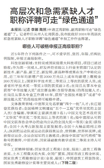 申请正高职称、副高职称可走“绿色通道”了。记者昨日从市人社局获悉,我市就做好2024年高层次和急需紧缺人才职称评聘“绿色通道”申报工作作出部署。(今日《郑州日报》1版、2版)
