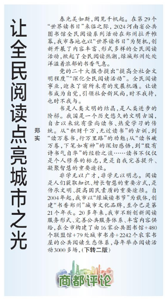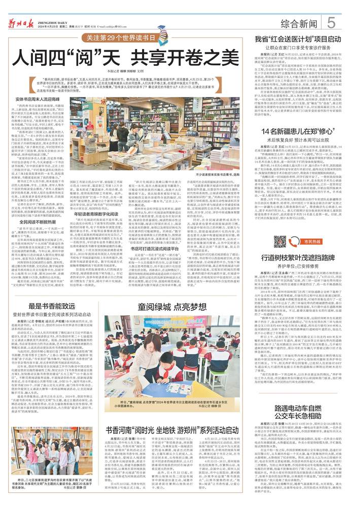 春光美如斯,阅见千帆起。在第29个“世界读书日”来临之际, 2024河南省公共图书馆全民阅读系列活动在郑州拉开帷幕,我市各地也以“世界读书日”为契机,创新开展了内容丰富、形式多样的全民阅读活动,掀起了全民阅读热潮,绿城郑州处处洋溢着浓郁的书香气息。(今日《郑州日报》1版、2版)