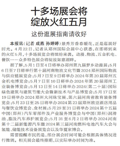 景秀芳香春暖花,正是逛展好时光。4月22日,记者从郑州国际会展中心获悉,在即将到来的火红5月,十多场展览会将缤纷来袭。动漫、物流、五金机电、餐饮……众多特色展会将绽放如意湖畔。(今日《郑州日报》1版)