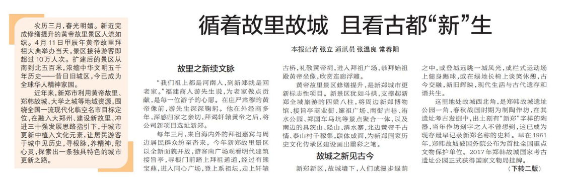 农历三月,春光明媚。新近完成修缮提升的黄帝故里景区人流如织。4月11日甲辰年黄帝故里拜祖大典举办当天,景区接待游客即超过10万人次。扩建后的景区从南到北五百米,浓缩中华文明五千年历史——昔日旧城区,今已成为全球华人精神家园。(今日《郑州日报》1版、2版)