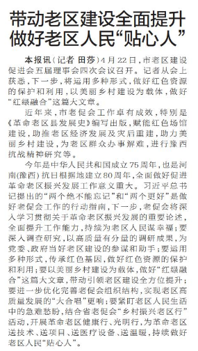 4月22日,市老区建设促进会五届理事会四次会议召开。记者从会上获悉,下一步,将运用多种形式,做好红色资源的保护和利用,以美丽乡村建设为载体,做好“红绿融合”这篇大文章。(今日《郑州日报》2版)