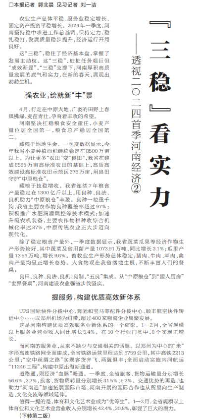 农业生产总体平稳、服务业稳定增长、固定资产投资平稳增长。2024年一季度,河南坚持稳中求进工作总基调,保持定力、稳扎稳打,发展质量稳步提升,经济运行开局良好。
