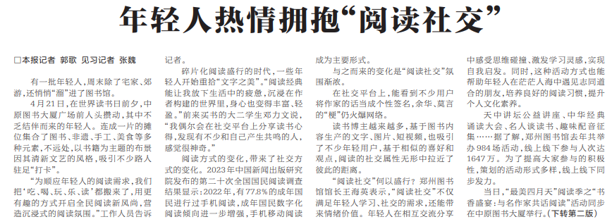 4月22日上午,2024年郑州市“4·23世界读书日”暨图书馆服务宣传周活动启动仪式在郑州图书馆举行。(今日《郑州日报》1版、5版)
