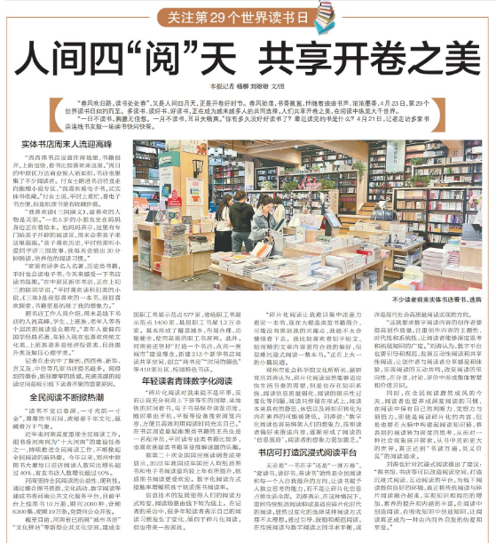 “春风吹归路,读书处处春”,又是人间四月天,正是开卷好时节。春风骀荡,书香氤氲,伴随着琅琅书声、浓浓墨香,4月23日,第29个世界读书日如约而至。多读书、读好书、好读书,正在成为越来越多人的共同选择,人们共享开卷之美,在阅读中纵览大千世界。(今日《郑州日报》5版)