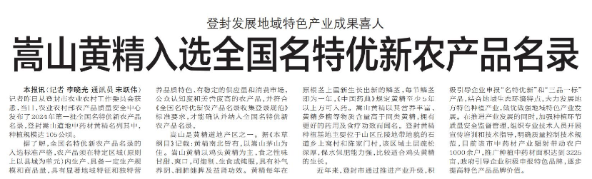记者昨日从登封市农业农村工作委员会获悉,当日,农业农村部农产品质量安全中心发布了2024年第一批全国名特优新农产品名录,登封嵩山道地中药材黄精名列其中,种植规模达105公顷。(今日《郑州日报》7版)