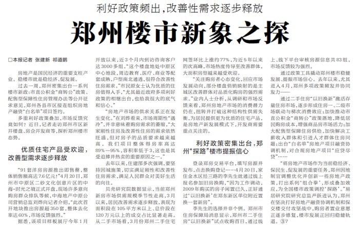 多重利好政策叠加,市场反馈究竟如何?近日,记者走访郑州市区新开楼盘、房企开发商等,探析郑州楼市态势。(今日《河南日报》5版)