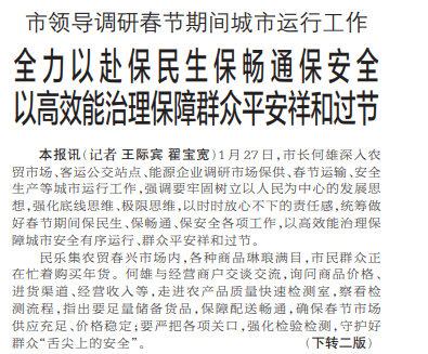1月27日,市长何雄深入农贸市场、客运公交站点、能源企业调研市场保供、春节运输、安全生产等城市运行工作,强调要牢固树立以人民为中心的发展思想,强化底线思维、极限思维,以时时放心不下的责任感,统筹做好春节期间保民生、保畅通、保安全各项工作,以高效能治理保障城市安全有序运行、群众平安祥和过节。(今日《郑州日报》1版、2版)