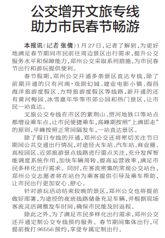 1月27日,记者了解到,为更好地满足春节期间市民前往周边景区出行需求,提升公交服务水平和保障能力,郑州公交采取系列措施,为市民春节出行和游玩提供便利。(今日《郑州日报》2版)