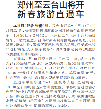 想去云台山玩吗?1月30日(正月初二)起,郑州交运集团旅游公司开通云台山新春直通车。1月30日至2月12日(正月初二至正月十五),每日发车,一站式直达云台山冰瀑奇观与国潮庙会现场,每日发班、无忧往返,带乘客穿越冰雪童话秘境,沉浸式体验非遗打铁花、万人饺子宴等18项新春限定民俗,共度热气腾腾的山水中国年。(今日《郑州日报》2版)