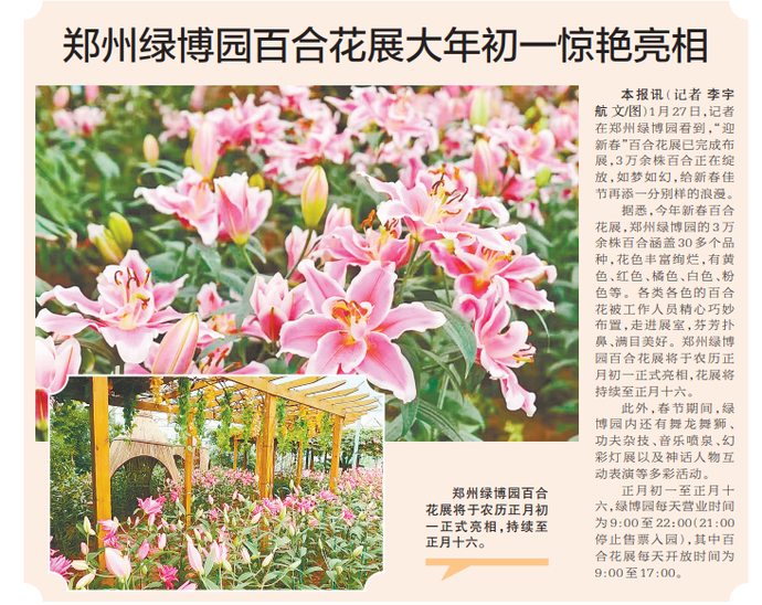 1月27日,记者在郑州绿博园看到,“迎新春”百合花展已完成布展,3万余株百合正在绽放,如梦如幻,给新春佳节再添一分别样的浪漫。(今日《郑州日报》2版)