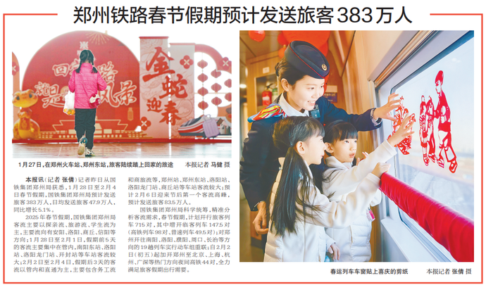 记者昨日从国铁集团郑州局获悉,1月28日至2月4日春节假期,国铁集团郑州局预计发送旅客383万人,日均发送旅客47.9万人,同比增长5.1%。(今日《郑州日报》4版)