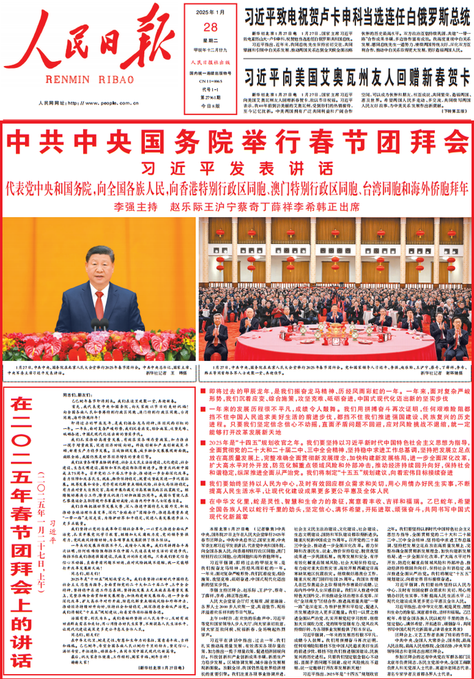 中共中央、国务院27日上午在人民大会堂举行2025年春节团拜会。中共中央总书记、国家主席、中央军委主席习近平发表讲话,代表党中央和国务院,向全国各族人民,向香港特别行政区同胞、澳门特别行政区同胞、台湾同胞和海外侨胞拜年。(今日《人民日报》1版)
