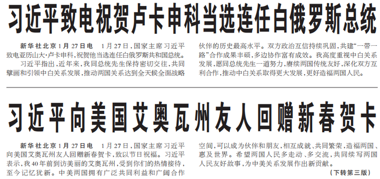 1月27日,国家主席习近平致电亚历山大·卢卡申科,祝贺他当选连任白俄罗斯共和国总统。(今日《人民日报》1版)