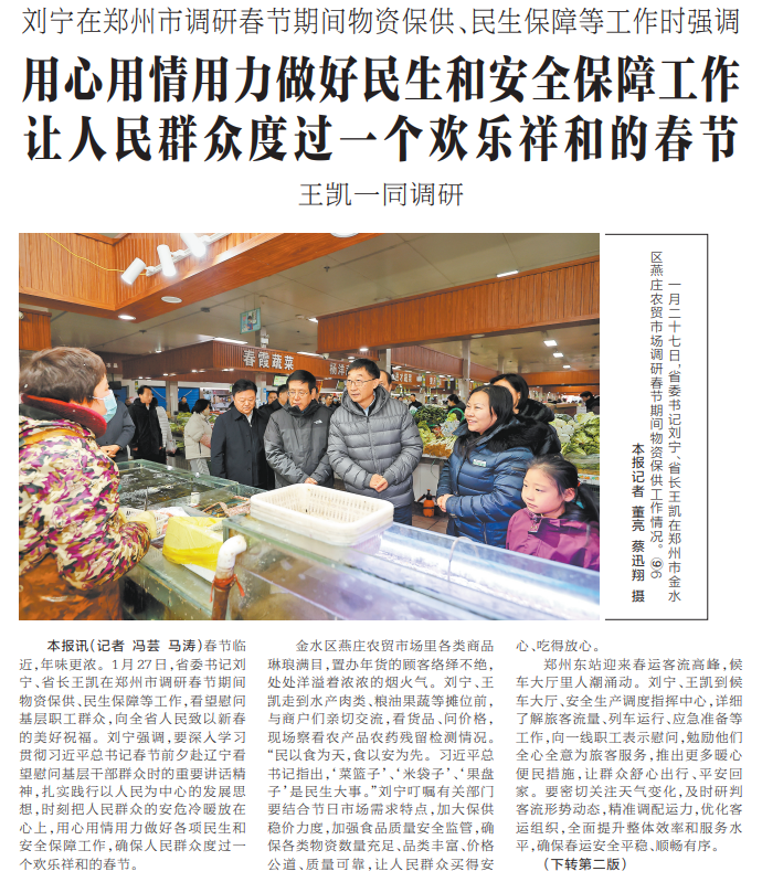春节临近,年味更浓。1月27日,省委书记刘宁、省长王凯在郑州市调研春节期间物资保供、民生保障等工作,看望慰问基层职工群众,向全省人民致以新春的美好祝福。刘宁强调,要深入学习贯彻习近平总书记春节前夕赴辽宁看望慰问基层干部群众时的重要讲话精神,扎实践行以人民为中心的发展思想,时刻把人民群众的安危冷暖放在心上,用心用情用力做好各项民生和安全保障工作,确保人民群众度过一个欢乐祥和的春节。(今日《河南日报》1版、2版)