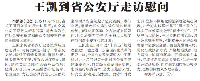 1月27日,省长王凯到省公安厅走访慰问,向全省公安干警致以新春祝福,对大家为维护社会安全稳定和群众幸福安宁作出的贡献表示感谢。(今日《河南日报》1版)