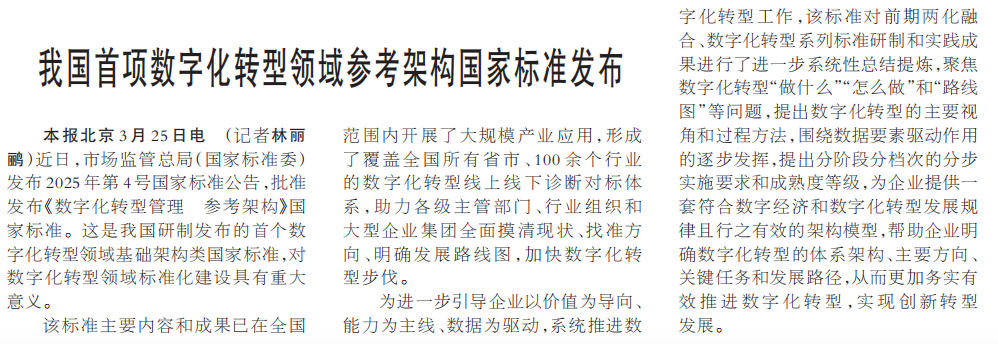 近日,市场监管总局(国家标准委)发布2025年第4号国家标准公告,批准发布《数字化转型管理 参考架构》国家标准。这是我国研制发布的首个数字化转型领域基础架构类国家标准,对数字化转型领域标准化建设具有重大意义。(今日《人民日报》2版)