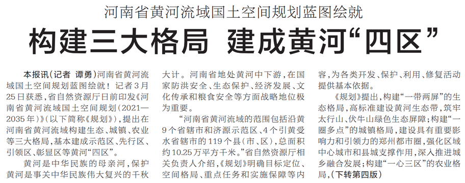 河南省黄河流域国土空间规划蓝图绘就!记者3月25日获悉,省自然资源厅日前印发《河南省黄河流域国土空间规划(2021—2035年)》(以下简称《规划》),提出在河南省黄河流域构建生态、城镇、农业等三大格局,基本建成示范区、先行区、引领区、彰显区等黄河“四区”。(今日《河南日报》1版、4版)