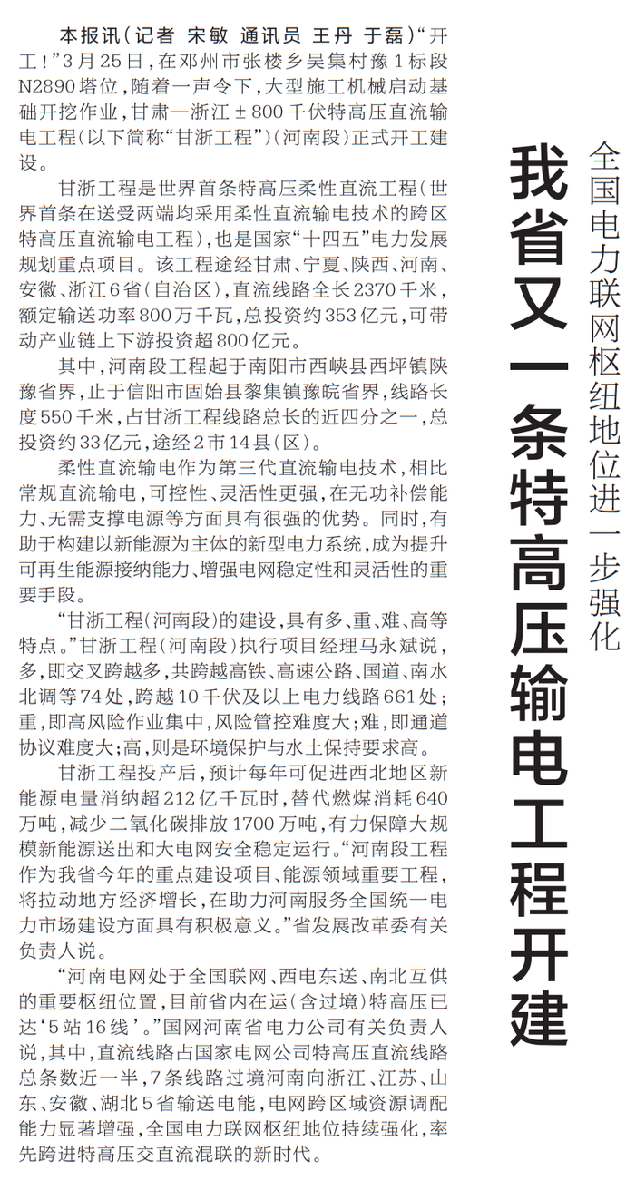 “开工!”3月25日,在邓州市张楼乡吴集村豫1标段N2890塔位,随着一声令下,大型施工机械启动基础开挖作业,甘肃—浙江±800千伏特高压直流输电工程(以下简称“甘浙工程”)(河南段)正式开工建设。(今日《河南日报》1版)