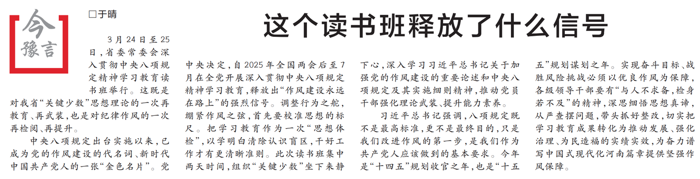 3月24日至25日,省委常委会深入贯彻中央八项规定精神学习教育读书班举行。这既是对我省“关键少数”思想理论的一次再教育、再武装,也是对纪律作风的一次再检阅、再提升。(今日《河南日报》1版)
