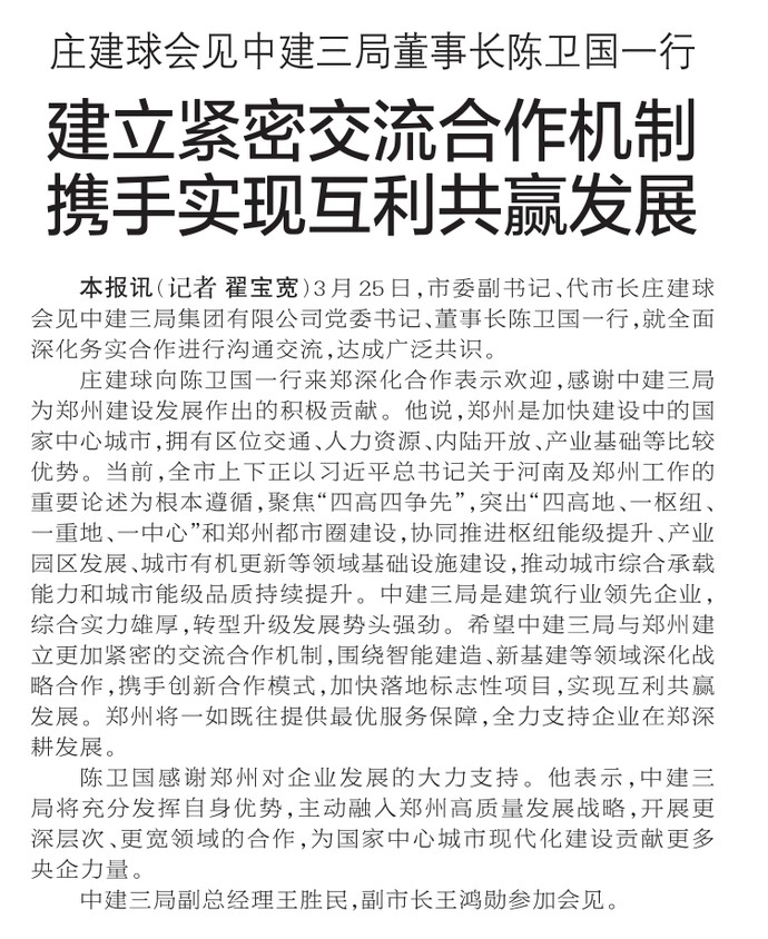 3月25日,市委副书记、代市长庄建球会见中建三局集团有限公司党委书记、董事长陈卫国一行,就全面深化务实合作进行沟通交流,达成广泛共识。(今日《郑州日报》1版)