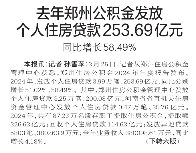 3月25日,记者从郑州住房公积金管理中心获悉,郑州住房公积金2024年年度报告发布。2024年,发放个人住房贷款3.99万笔、253.69亿元,同比分别增长51.02%、58.49%。其中,郑州住房公积金管理中心发放个人住房贷款3.25万笔、200.08亿元,河南省省直机关住房资金管理中心发放个人住房贷款0.47万笔、35.76亿元。2024年,共有87.23万名缴存职工提取住房公积金,提取额326.63亿元;回收个人住房贷款114.63亿元;发放异地贷款5803笔、380263.9万元;全年业务收入380098.61万元,同比增长4.18%。 (今日《郑州日报》1版)