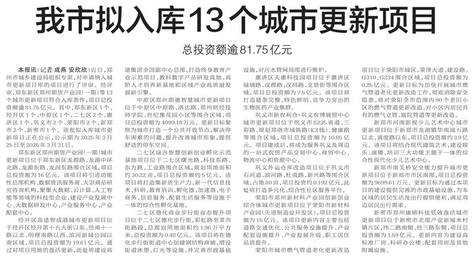 近日,郑州市城乡建设局组织专家,对申请纳入城市更新项目库的项目进行了评审。经评审,郑东新区郑州期货产业园(一期)等13个城市更新项目符合入库条件,项目总投资额逾81.75亿元。其中,郑东新区1个、经开区1个、中原区1个、二七区2个、惠济区1个、巩义市2个、荥阳市2个、新郑市2个、新密市1个。该批拟入库城市更新项目正在公示,公示期为2025年3月25日至2025年3月31日。(今日《郑州日报》2版)