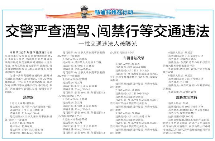 记者从郑州市公安局公安交通管理局获悉,即日起至5月底,郑州警方将在城区范围内开展道路交通秩序畅通服务大提升行动,全力实现交通秩序的明显改观、管理效果的明显提升、群众满意度和获得感的明显增强。(今日《郑州日报》5版)