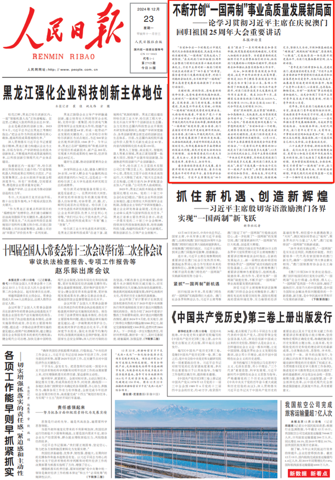 “当前和今后一个时期是以中国式现代化全面推进强国建设、民族复兴伟业的关键时期,‘一国两制’实践也进入了新阶段。”在庆祝澳门回归祖国25周年大会暨澳门特别行政区第六届政府就职典礼上,习近平主席对新一届澳门特别行政区政府提出了“四个着力”的希望,蕴含着对澳门发展的深邃思考、对澳门同胞的亲切关怀,为不断开创“一国两制”事业高质量发展新局面提供了方向和行动指引。(今日《人民日报》1版)