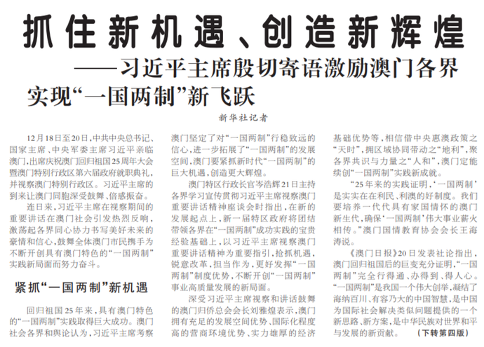 12月18日至20日,中共中央总书记、国家主席、中央军委主席习近平亲临澳门,出席庆祝澳门回归祖国25周年大会暨澳门特别行政区第六届政府就职典礼,并视察澳门特别行政区。习近平主席的到来让澳门同胞深受鼓舞、倍感振奋。(今日《人民日报》1版、4版)