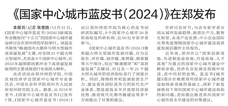 12月21日,《国家中心城市蓝皮书(2024)》新闻发布会暨面向“十五五”的国家中心城市建设研讨会在郑州师范学院举行。该蓝皮书聚焦“畅通国内大循环与特大型城市高质量发展”主题,对全国21个超大特大型城市,尤其是9个国家中心城市,在2023年超预期因素冲击下高质量发展取得的主要成效进行全面深入解析。(今日《郑州日报》1版)