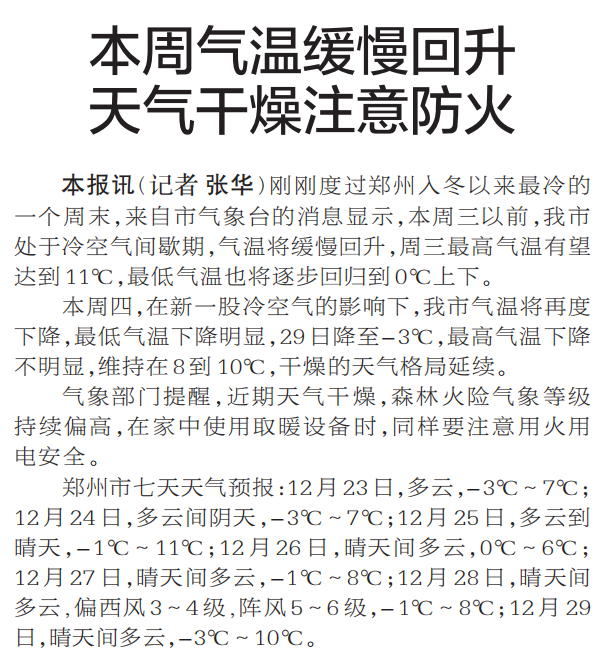 刚刚度过郑州入冬以来最冷的一个周末,来自市气象台的消息显示,本周三以前,我市处于冷空气间歇期,气温将缓慢回升,周三最高气温有望达到11℃,最低气温也将逐步回归到0℃上下。(今日《郑州日报》1版)