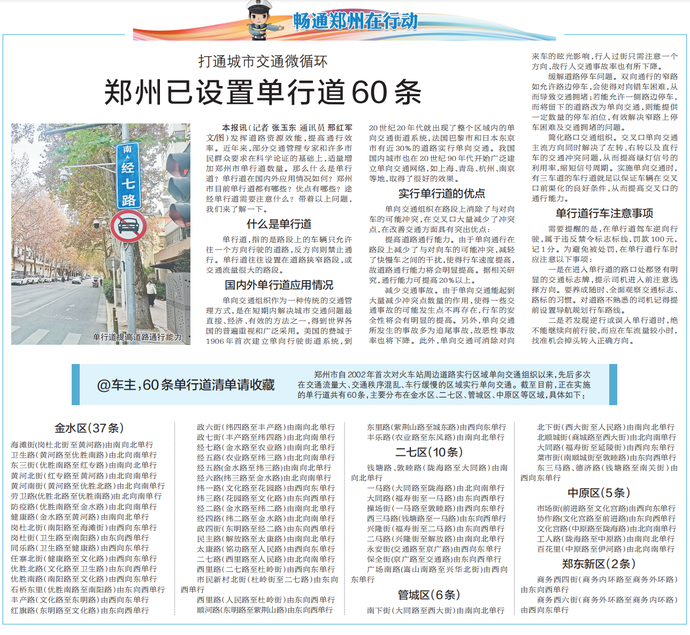 发挥道路资源效能,提高通行效率。近年来,部分交通管理专家和许多市民群众要求在科学论证的基础上,适量增加郑州市单行道数量。那么什么是单行道?单行道在国内外应用情况如何?郑州市目前单行道都有哪些?优点有哪些?途经单行道需要注意什么?带着以上问题,我们来了解一下。(今日《郑州日报》2版)