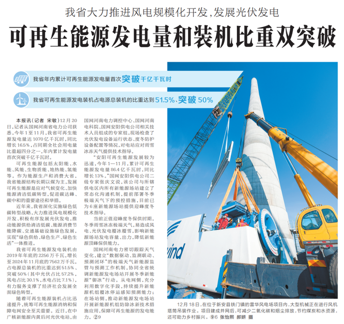 12月20日,记者从国网河南省电力公司获悉,今年1至11月,我省可再生能源发电量达1070亿千瓦时,同比增长16.5%,占同期全社会用电量比重超四分之一,年内累计发电量首次突破千亿千瓦时。(今日《河南日报》2版)