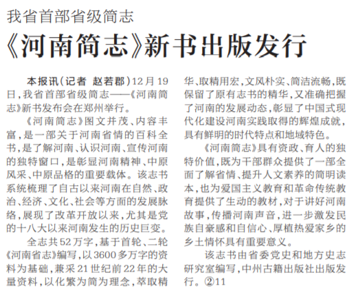 12月19日,我省首部省级简志——《河南简志》新书发布会在郑州举行。