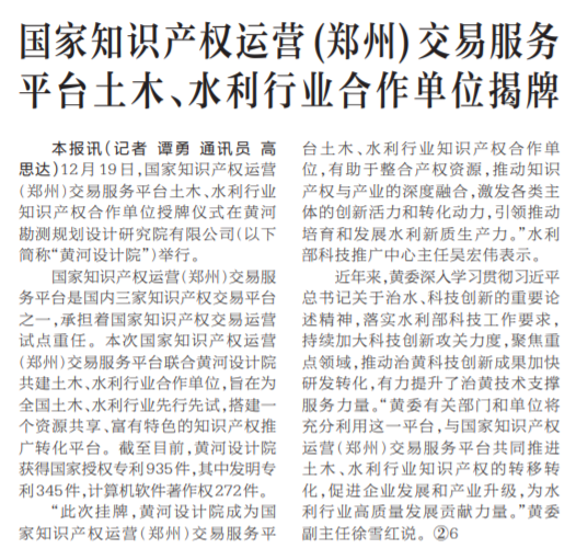 12月19日,国家知识产权运营(郑州)交易服务平台土木、水利行业知识产权合作单位授牌仪式在黄河勘测规划设计研究院有限公司(以下简称“黄河设计院”)举行。(今日《河南日报》2版)