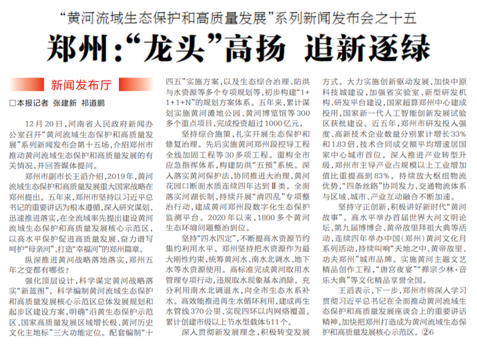 12月20日,河南省人民政府新闻办公室召开“黄河流域生态保护和高质量发展”系列新闻发布会第十五场,介绍郑州市推动黄河流域生态保护和高质量发展的有关情况,并回答媒体提问。(今日《河南日报》4版)