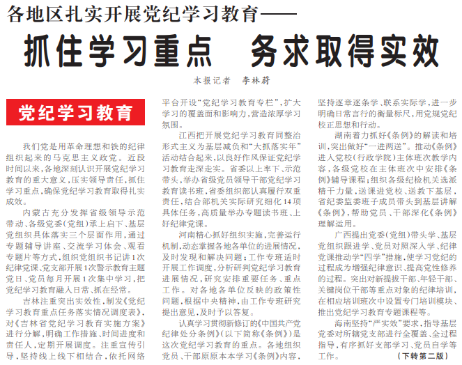 我们党是用革命理想和铁的纪律组织起来的马克思主义政党。近段时间以来,各地深刻认识开展党纪学习教育的重大意义,压实领导责任,抓住学习重点,确保党纪学习教育取得扎实成效。(今日《人民日报》1版、2版)
