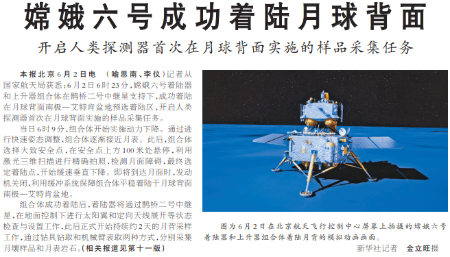 记者从国家航天局获悉:6月2日6时23分,嫦娥六号着陆器和上升器组合体在鹊桥二号中继星支持下,成功着陆在月球背面南极—艾特肯盆地预选着陆区,开启人类探测器首次在月球背面实施的样品采集任务。(今日《人民日报》1版、11版)