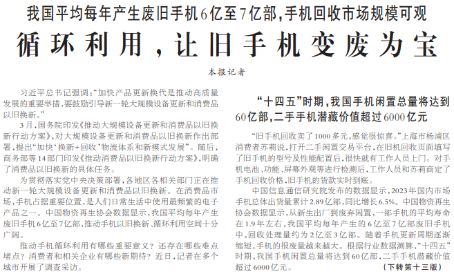 我国平均每年产生废旧手机6亿至7亿部,手机回收市场规模可观